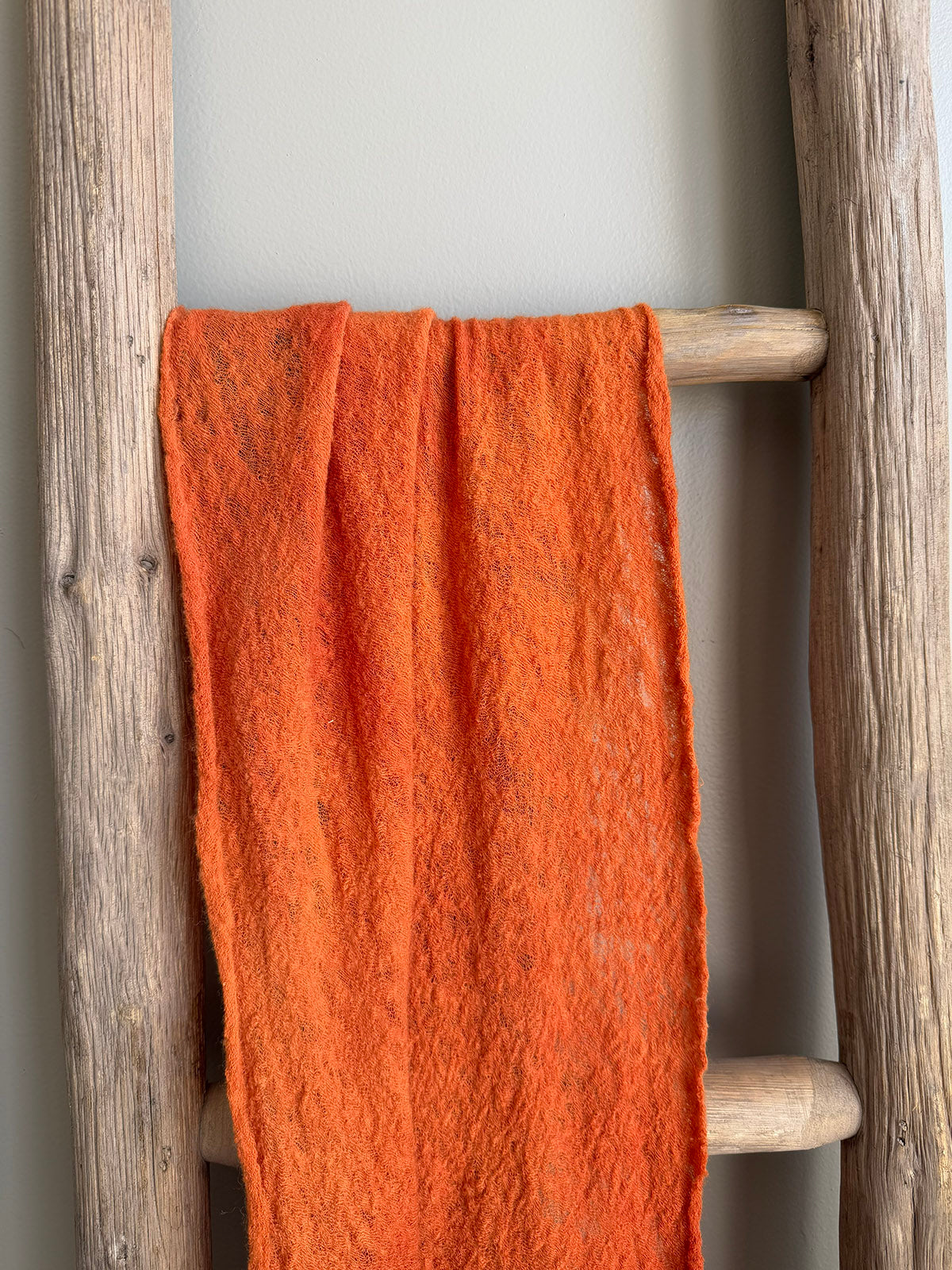 This wool scarf is hand-dyed using natural dyes, combining extracts from the Sappanwood tree (Caesalpinia spp.) and the Weld plant (Reseda luteola) to produce a rich orange sorbet colour.